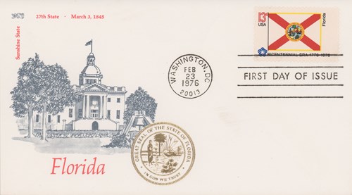 The US Post Office commemorated the 1976 American Bicentennial by issuing a full pane of stamps showing the flags of each state on February 23, 1976. The stamp on this cacheted cover features the flag of Florida, the 27th state to enter the Union.
