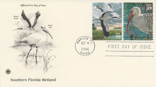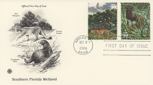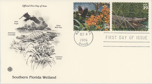 These five cacheted covers feature all ten of the different commemorative stamp designs in the US Post Office Southern Florida Wetland stamp series, part of its larger Nature of America series. Taken together, these stamps depict a wetland environment and the wildlife that lives there. The first-day-of-issue event for the Southern Florida Wetland stamps took place on October 4, 2006, at the Naples Zoo and Caribbean Gardens in Naples, Florida.
