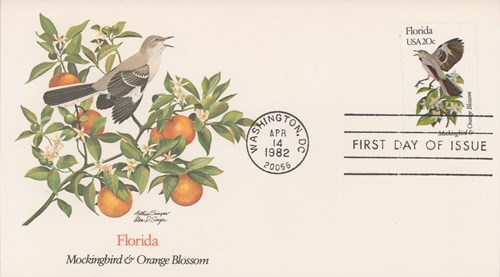On April 14, 1982, the US Post Office issued a full pane of stamps showing the official birds and flowers for each of the fifty states in the nation. Florida’s official bird is the mockingbird, and its official flower is the orange blossom as seen on the stamp and cacheted cover.