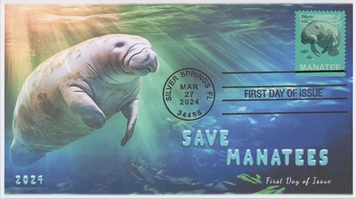 The US Post Office issued the commemorative stamp on this cacheted cover on Manatee Appreciation Day, March 27, 2024. The first-day-of-issue ceremony took place at Silver Springs.