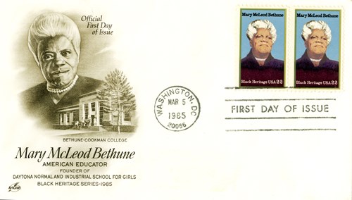 This cacheted cover and its commemorative stamps honor famed educator and civil rights activist Mary McLeod Bethune who founded a school in Daytona Beach known today as Bethune-Cookman University. The US Post Office issued the stamp on March 5, 1985, as part of its Black Heritage stamp series.
