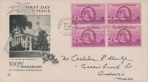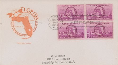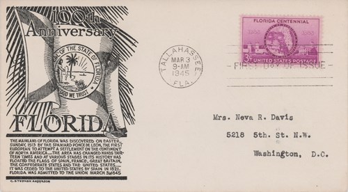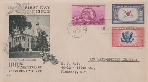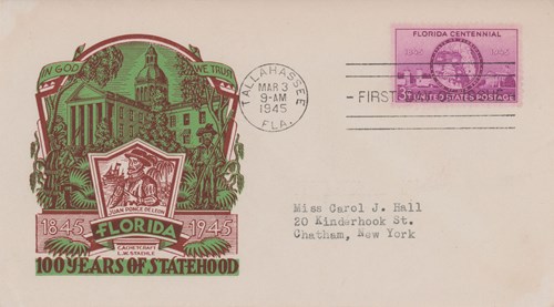 Florida became a state on March 3, 1845. These cacheted covers and their commemorative Florida Centennial stamps celebrate that milestone anniversary. The US Post Office issued the Florida Centennial stamp in Tallahassee on March 3, 1945. The additional stamps on the bottom cover may have been added for extra postage to send the cover by air mail and special delivery.
