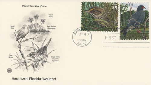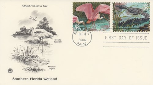 These five cacheted covers feature all ten of the different commemorative stamp designs in the US Post Office Southern Florida Wetland stamp series, part of its larger Nature of America series. Taken together, these stamps depict a wetland environment and the wildlife that lives there. The first-day-of-issue event for the Southern Florida Wetland stamps took place on October 4, 2006, at the Naples Zoo and Caribbean Gardens in Naples, Florida.