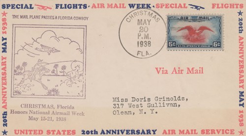 National Air Mail Week took place May 15–21, 1938, to celebrate twenty years since the start of US air mail service and to promote use of air mail. The US Post Office encouraged cities and towns nationwide to come up with their own commemorative designs for covers and issued a new six cent air mail stamp for the occasion. National Air Mail Week was a great success.