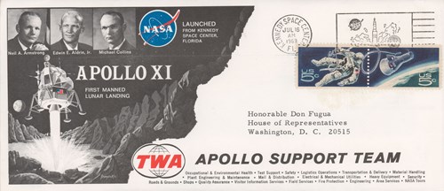 Trans World Airlines (TWA) contracted with NASA to provide a variety of support services for the space agency. This cover promotes TWA’s contributions to the Apollo 11 mission, the first crewed mission to land on the Moon. It launched on July 16, 1969. The cover features the first “twin stamps” issued by the US Post Office. Twin stamps are a connected pair of stamps with one continuous image. The design of these twin stamps, first issued in 1967, was based on a 1965 Gemini mission spacewalk.