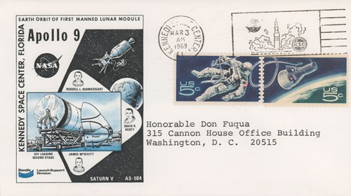 Apollo 9 launched on March 3, 1969, with the main goal of testing the manned Lunar Module, the spacecraft that astronauts would use to land on the Moon. This cover features the first “twin stamps” issued by the US Post Office. Twin stamps are a connected pair of stamps with one continuous image. The design of these twin stamps, first issued in 1967, was based on a 1965 Gemini mission spacewalk.