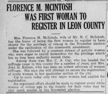 (Image: After suffrage passed, Florida’s white women were quickly called on to register to vote to offset a feared wave of Black women voters. Tallahassee Daily Democrat, September 9, 1920)