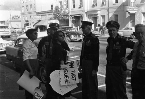 Priscilla (l) and Patricia (r) Stephens picketing downtown stores, 1960